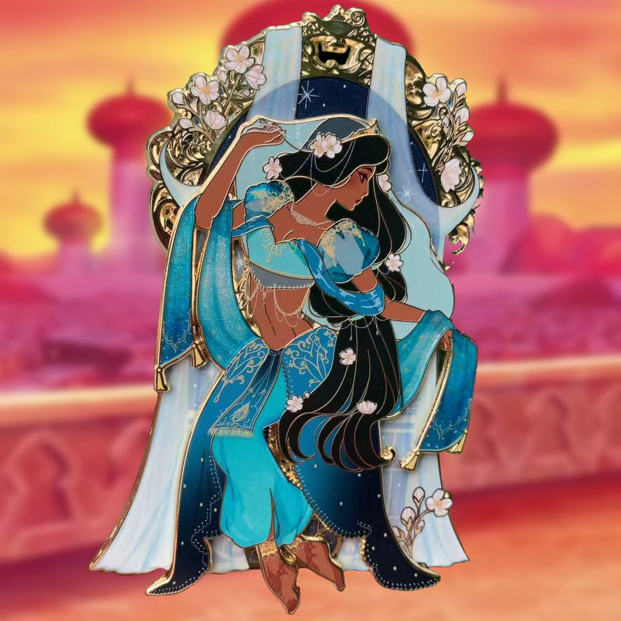 This hard enamel double layer pin measures 4" with gold finish. It features a custom back stamp, metal framing, glitter, and screen printing effects. LE30