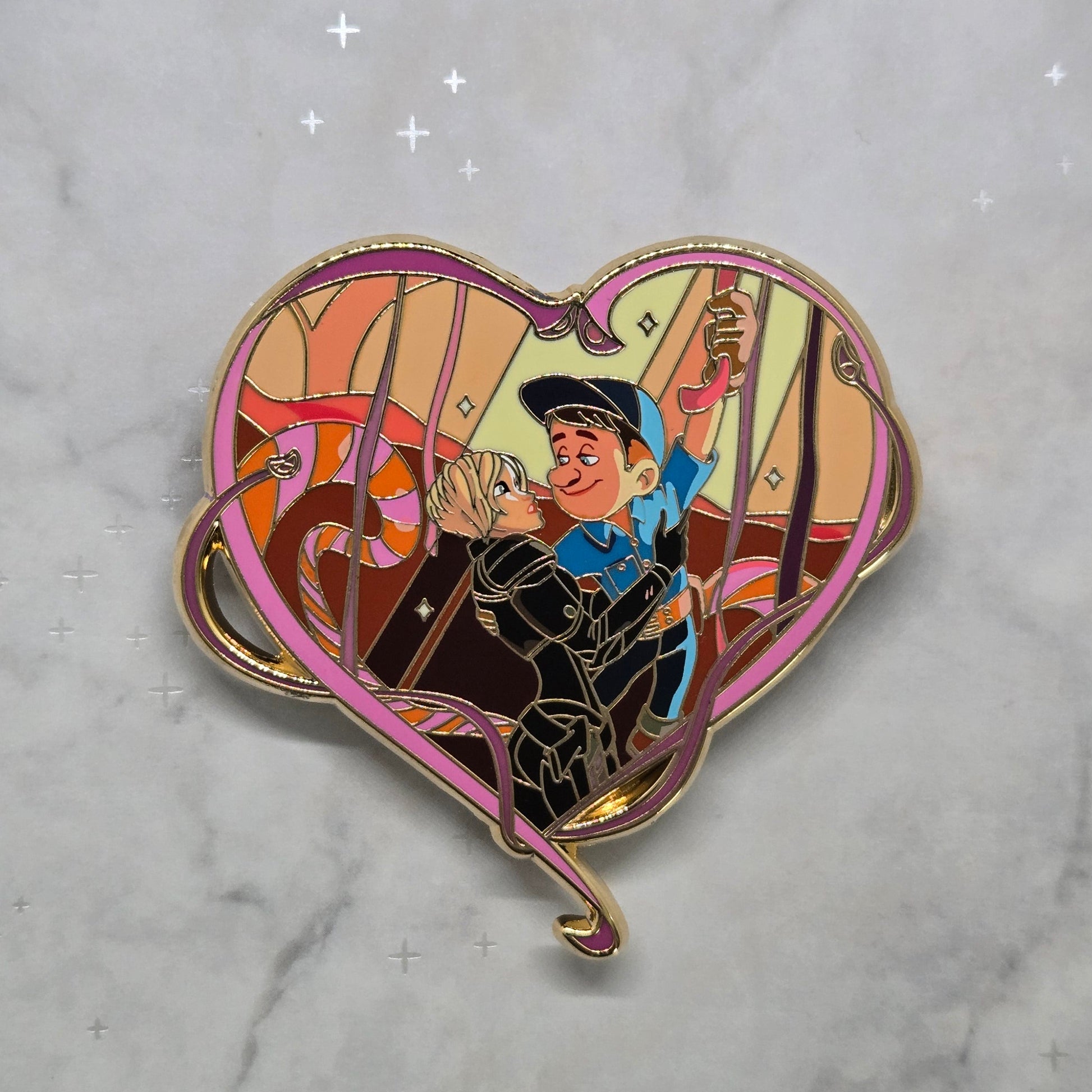 This hard enamel pin measures 2.5" with gold finish. It features a custom back stamp and screen printing effects. LE35